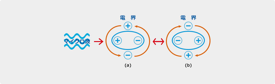水を例にすると、その內部においてプラスのイオンとマイナスの電子が対を成している。これにマイクロ波が照射されると、図1(a)のようにイオンと電子の対が電界の方向に回転する。この電界が図1(b)のように逆さになるとイオンと電子の対も逆の配列に回転する。この回転により失われたエネルギーがマイクロ波減衰量となる。したがって、水分量が多ければそれだけ回転させる分子量が増加するので、減衰量も多くなる。