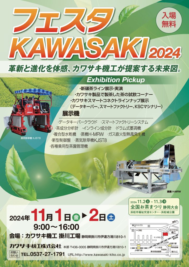 その他、近年話題の蒸気除草機の展示、カワサキの製茶機械で製造した、煎茶、碾茶、発酵茶の試飲コーナーなど様々な機械を展示いたします。それ以外にも近年話題の製品の展示をいたしますので、是非この機會にご來場いただき、製茶機?乗用型茶園管理機の実機をご確認頂きますようお願いします。